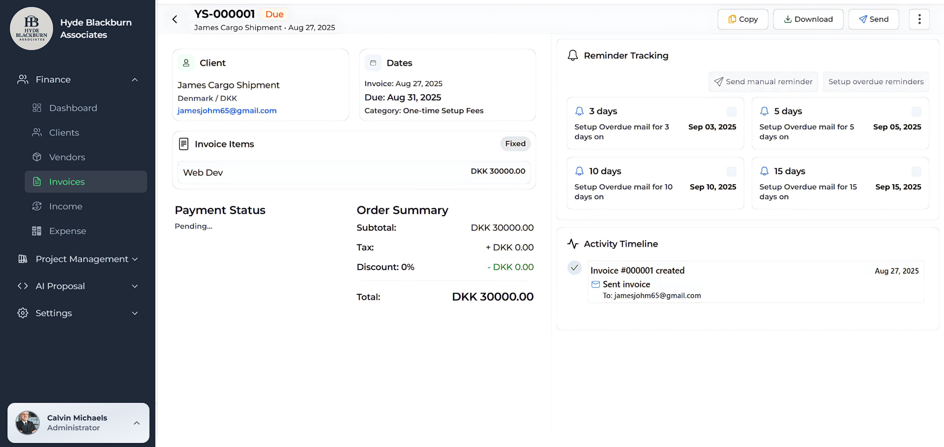 One of Tymora’s most unique and powerful features is the ability to manually set overdue payment reminders. This isn’t something you’ll find in every invoicing tool—and it’s a real game-changer.