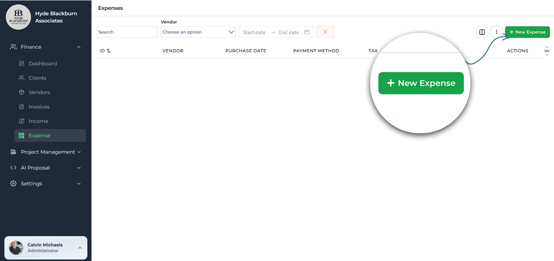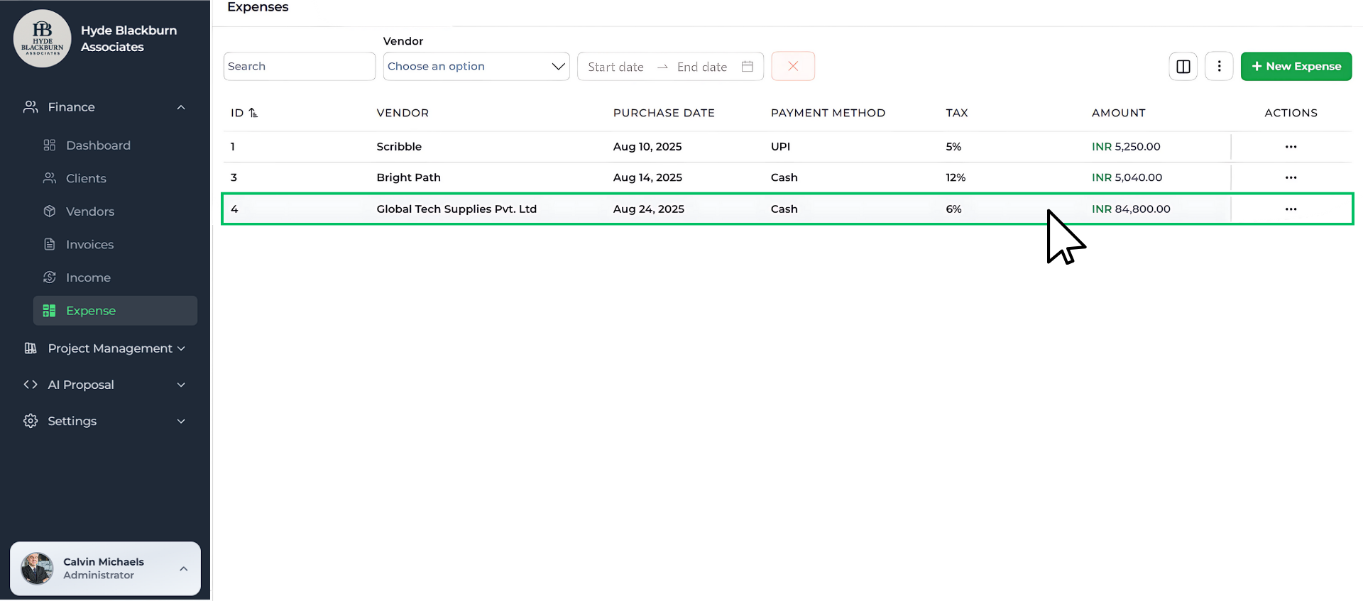 The expense will appear in your list under Finance → Expense showing vendor, purchase date, payment method, tax, and amount.